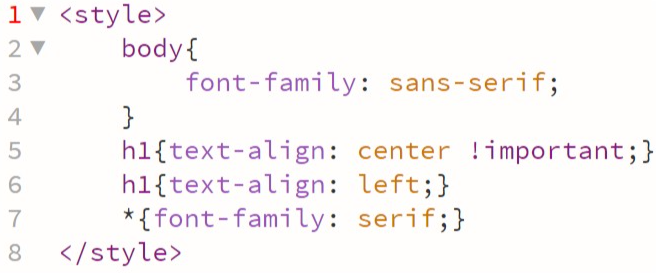 Có lệnh !important sẽ bắt buộc thẻ <h1> phải được gán theo thuộc tính ở dòng 5, ưu tiên hơn các quy tắc khác.
